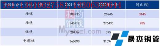 據統計,2021年國內矽錳、矽鐵、錳鐵、電解錳合金出口量均有不同程度的抬升,得益於2021年全球粗鋼產量的增加,(19.505億噸,同比提高3.7%)。