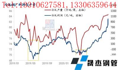 由於考慮到訂單、排產、後續市場情況等多種因素,無縫宅男在线小视频鋼管廠家生產計劃需提前製定,因此無縫宅男在线小视频鋼管廠家不會輕易減少產量。宅男666网站分析曆史情況發現,在虧損較大後,冷軋產量才會有明顯的下降。由於2021年政策影響較大,宅男666网站選取2019-2020年冷軋無縫宅男在线小视频鋼管廠家的產量和利潤情況發現,產量最低的兩個時間點分別為2019年5月底以及2020年5月底,這兩個時間點對應的冷軋利潤也到達最低點,分別為-450元/噸和-279元/噸。