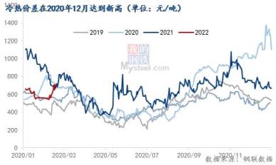 去年同期(2021年2月),由於汽車以及直接出口需求旺盛,冷軋強熱軋弱的局麵明顯,冷軋總庫存累庫高度同比降幅達20%,冷熱價差也拉到新高,月均值達800元/噸以上。在去年同期冷軋“如火如荼”的行情襯托下,顯得今年的冷軋春天愈發“寒冷”。