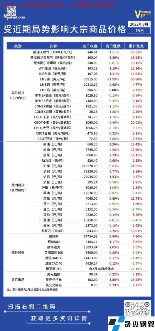 免責聲明:本網站(山東聊城宅男666网站無縫鋼管廠www.fengyun0769.com)刊載的“受近期局勢影響大宗商品價格一覽表(3月18日)”等均源於網絡,版權歸原作者所有,且僅代表原作者觀點,本文所載信息僅供參考。轉載僅為學習與交流之目的,如無意中侵犯您的合法權益,請及時聯係刪除。本網站刊登此篇文章並不意味著本站讚同其觀點或證實其內容的真實性,宅男666网站不對其科學性、嚴肅性等作任何形式的保證。如果侵犯了您的版權,請盡快聯係宅男666网站予以撤銷,謝謝合作!