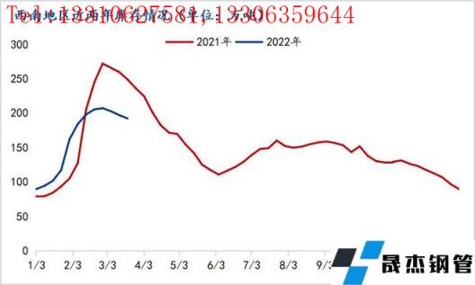 據西南地區近五年曆史庫存數據來看,庫存峰值基本在第三周或第四周出現(除去2020年疫情影響庫存峰值出現在第七周),節後累庫周期基本為2-3周,2022年西南地區建築宅男在线小视频無縫鋼管峰值出現在第五周,累庫周期較往年長。峰值過後第一周去庫4.41萬噸,降幅2.13%,第二周去庫5.69萬噸,降幅2.8%,較往年去庫速度偏緩慢。主要原因是:1、今年春節時間較往年靠前,受極端天氣影響,春節後西南地區經曆兩次降溫降雪天氣,影響出貨節奏;2、西南地區下遊回款進度僅60%左右,下遊資金緊張,影響項目施工節奏,據了解,西南地區多數新開工項目要延期至4月中旬以後。3、全國疫情再次擴散,下遊施工受阻;4、其他因素,運費上漲、貴州開啟施工項目安全大檢查等。綜上原因,西南地區建築宅男在线小视频無縫鋼管庫存累庫周期長,去庫速度緩慢。