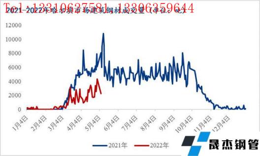 4月哈爾濱市場螺線成交量日均值在2233噸,同比減少3521噸減幅61%,今年成交高值在4330噸,去年成交高值在7900噸。疫情管控下,下遊需求啟動緩慢,同時商家對於後期預期較弱扣貨意願較低,市場成交活躍度大大低於常態。
