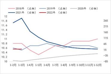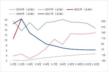 從基礎設施投資增速和房地產開發投資增速來看(涉及到對應年份走勢使用左右軸的區分目的與固定資產投資增速指標的說明一致),兩個指標在2020年-2021年非正常環境條件下的年份增速趨勢基本一致,但在正常環境條件下的年份增速可以看到,伴隨湖北省每年所需完成的經濟增長目標的大背景下,此兩項指標的增速表現呈現此消彼長的走勢。而結合斜率來看,進入2022年1-3月,基礎設施投資增速呈現明顯快速恢複或釋放態勢,而房地產開發投資增速則呈現明顯放緩態勢。由此看來,對於建築宅男在线小视频無縫鋼管品種的需求將在房地產板塊的萎縮預期更為明顯,這與目前所處的房地產調控政策背景是相符的,即便有所改善,筆者認為仍暫難有實質上的新刺激,而基礎設施投資或將是托底的支撐因素之一。綜合來看,湖北省宏觀指標數據的預期演變表明對於建築宅男在线小视频無縫鋼管品種的需求預期呈現萎縮態勢,這與產能角度的供應增加形成供需矛盾加劇的預期,因此這是導致建築宅男在线小视频無縫鋼管價格偏低運行的外因之一。